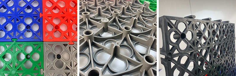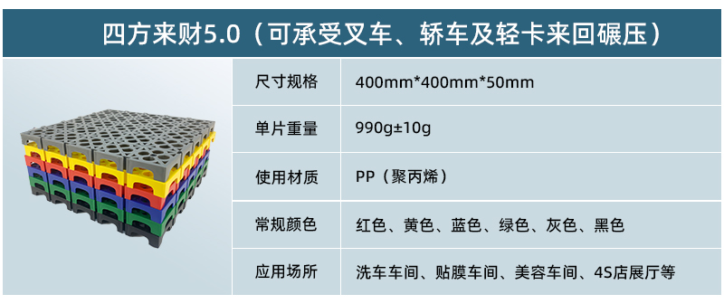 1. 分為3.4.5.厚度,解決不同厚度,統(tǒng)一紋路的問題 2. 啞光平紋設(shè)計,防滑,美觀,易清潔 3. 選用高級原料,加入其他輔料,顏色亮麗,無異味,無污染 4. 顏色為紅黃藍綠黑灰六色,滿足客戶用色需求,搭配屬于自己的風格 5. 通扣鎖扣設(shè)計,容易鋪設(shè)且容易拆卸打理 6. 加強支撐,不容易出現(xiàn)壓壞壓斷現(xiàn)象,滿足大多數(shù)車輛施工的要求 7. 使用年限長,五年超長質(zhì)保,使用無后顧之憂 8. 十字支撐,保證承載最大化的同時,且易排泥排水