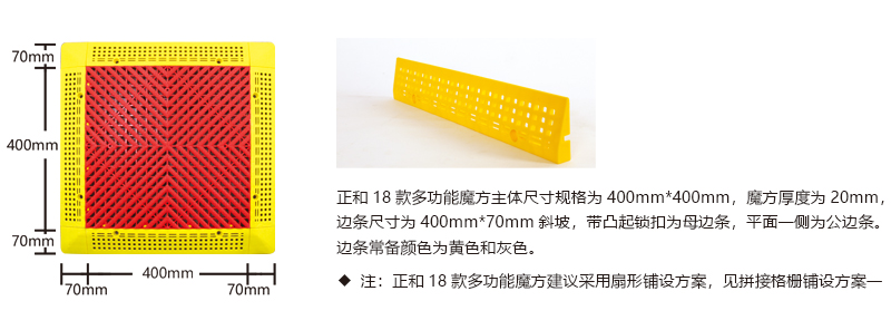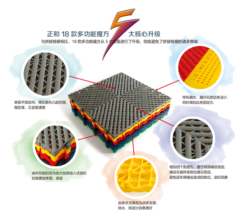 5、拼接格柵局部鋪設(shè)容易滑動,多功能魔方增加固定孔,局部鋪設(shè)可固定,更牢固;
