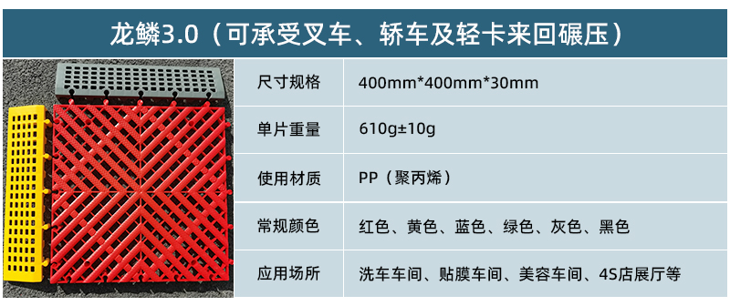 1.龍鱗紋設(shè)計(jì),防滑,美觀,寓意好 2.選用高級(jí)原料,加入其他輔料,顏色亮麗,無(wú)異味,無(wú)污染 3.顏色為紅黃藍(lán)綠黑灰六色,滿足客戶用色需求,搭配屬于自己的風(fēng)格 4.通扣鎖扣設(shè)計(jì),容易鋪設(shè)且容易拆卸打理 5.加強(qiáng)支撐,不容易出現(xiàn)壓壞壓斷現(xiàn)象,滿足大多數(shù)車輛施工的要求 6.使用年限長(zhǎng),3年超長(zhǎng)質(zhì)保,使用無(wú)后顧之憂 7.不同厚度,采用不同支撐,保證承載最大化的同時(shí),且易排泥排水